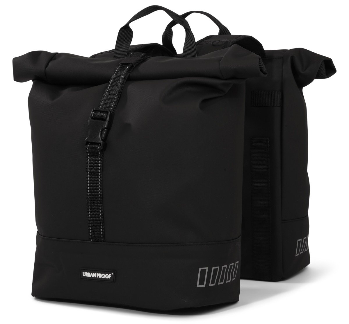 De Double Rolltop tas is de perfecte mix van strak en modern design, met een handige oprolbare sluiting die met een gesp vastklikt. Bevestig deze tas moeiteloos op je fiets en laat het gewicht van je spullen niet langer je rit verpesten. Dankzij de rolltop heb je altijd voldoende flexibiliteit in volume, terwijl je spullen veilig en beschermd blijven opgeborgen. Deze tas is gemaakt voor de gedreven Commuter die houdt van ruimte en een mooi ontwerp, maar ook begaan is met onze planeet. Hij is namelijk gemaakt van maar liefst 62 gerecyclede PET-flessen van 500ML. Ga voor deze edgy tas en maak een statement! E-Bike compatibel, MIK-systeemvriendelijk, waterbestendig en reflectie op de achterkant